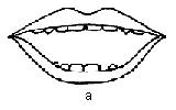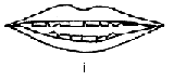 This diagram displays the two extreme lip postures and two intermediate lip postures. The high front cardinal vowel [ i ] has a very spread lip posture. The high back cardinal vowel [ u ] has a very tightly rounded lip posture. The low front cardinal vowel [ a ] has a spread lip posture but this is a more neutral posture than for [ i ] because the lower jaw position for this vowel causes the lips to be more open. The half-open back cardinal vowel [ ɔ ] has a rounded lip posture but the lips are more open then for [ u ] because of the lower jaw position. The actual lip posture for vowels in any particular language may be similar to that of the closest cardinal vowel with the same lip posture feature, but often speakers of many languages adopt a more neutral posture than would be indicated by these cardinal vowels. |