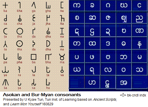 We have to write the letters, the glyphs, by hand. The basic shape of the glyph to represent the human sound dictates the ease of hand-writing. Burmese and Indic writers use the basic shape of the circle. Myanmar script demands more: a perfectly rounded circle. Each child of my child-hood days and before had to practice writing the perfect circle for many days, before we were allowed to write other glyphs. Bur-Myan used single and double circles without adding straight lines, whereas the most ancient Indic script, the Asokan Brahmi, has added lines.