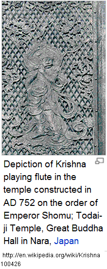 Since Jataka tales are given from the perspective of Buddha's previous lives (as well as the previous lives of many of Buddha's followers), Krishna appears as one of the lives of Sariputra, one of Buddha's foremost disciples and the "Dhammasenapati" or "Chief General of the Dharma" and is usually shown being Buddha's "right hand man" in Buddhist art and iconography.[103] The Bodhisattva, is born in this tale as one of his youngest brothers named Ghatapandita, and saves Krishna from the grief of losing his son.[100] The 'divine boy' Krishna as an embodiment of wisdom and endearing prankster is forming a part of worshipable pantheon in Japanese Buddhism.[104]