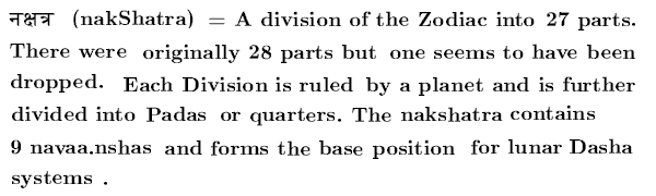 (nakShatra) - a division of the Zodiac into 27 parts. -