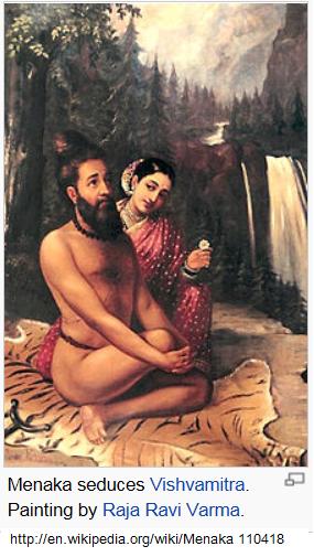 UKT: End of Wikipedia on Menaka.UKT: Below are five modern paintings from Wikipedia. The artist has added bras and upper garments to the females which obviously is not true to the spirit of the story. To the ancients, bare female breasts are just the signs of fertility which are sometimes exploited by unscrupulous persons to harm another. - UKT 110417