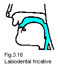 Voiceless (vl.) labiodental fricative. /f/ . The lower lip is brought close to the upper teeth, occasionally even grazing the teeth with its outer surface, or with its inner surface, imparting in this case a slight hushing sound. Fig.3.16. Considering its place of articulation (POA), it is unimportant to class this sound as dorsal or lateral.